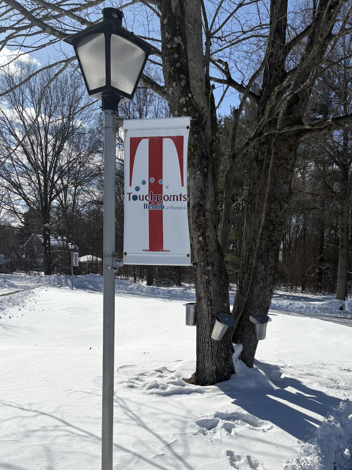 The season typically runs from mid-February through the end of March, when cold nights and milder daytime temperatures create the ideal conditions for sap to flow. Across Bloomfield, Mark taps approximately 100 trees each season, hanging buckets to collect the clear sap as it drips steadily throughout the day. About a dozen of those buckets can be found right on the Touchpoints at Bloomfield campus, offering a firsthand look at a classic New England tradition.