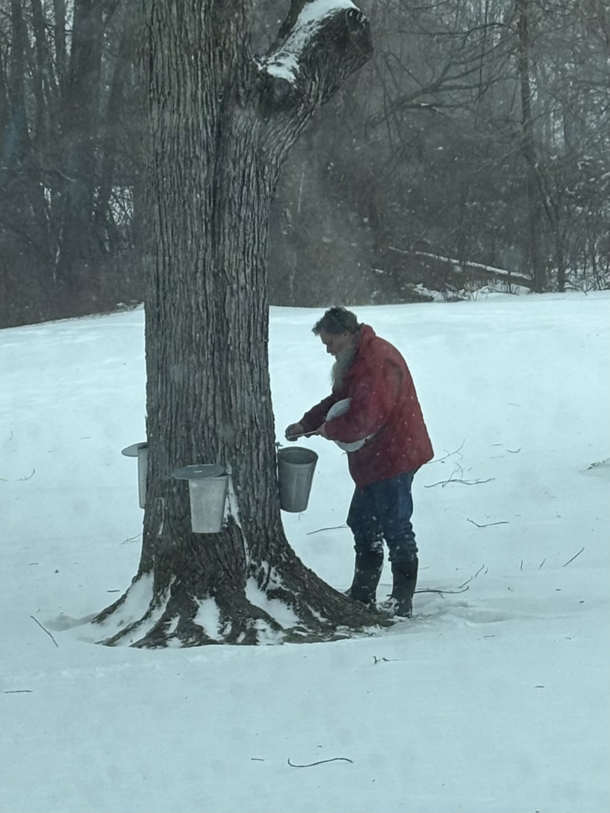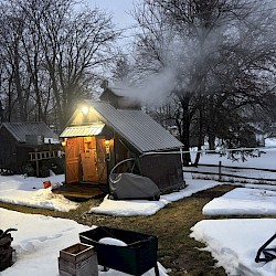 Throughout the season, the collected sap is transported to the couple’s sugar shack, where it is poured into a large pan and slowly boiled down over several hours. As the water evaporates, the sap gradually thickens and deepens in color, becoming rich maple syrup. The transformation from tree to table is both simple and fascinating — a reminder of how closely tied the process is to patience, timing, and the rhythms of the season.