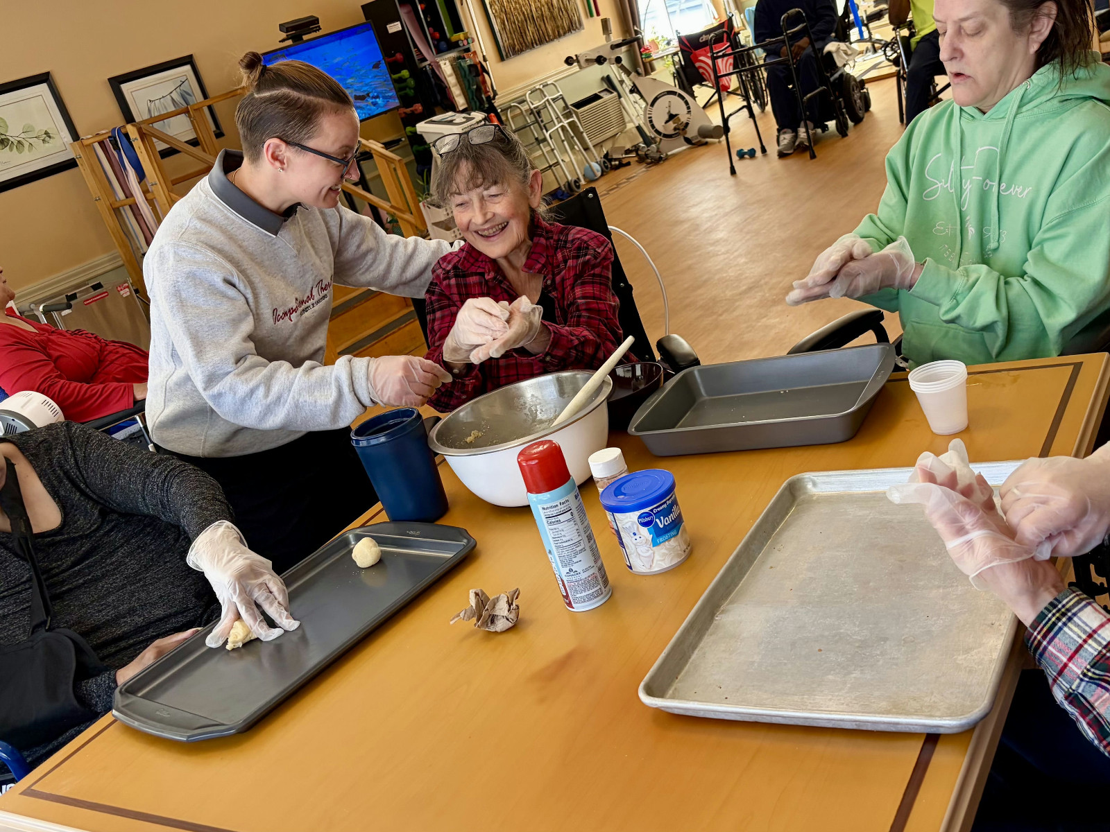 Residents took part in a hands-on exercise centered on home-management tasks, practicing skills such as measuring, sequencing steps, problem-solving, and fine motor coordination. While the activity felt festive and fun, each component was intentionally designed by the therapy team to support functional ability and confidence in real-world situations.